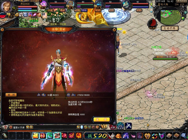 在这里,有个东西要提一下。现在出来觉醒了,说说我的用法。2倍精血领双去练功场,加速炼化。点了炼化,马上点加速,因为缩短一半,晚点那个不太合适,幻化草(现在血魂62星)每天就合2次。