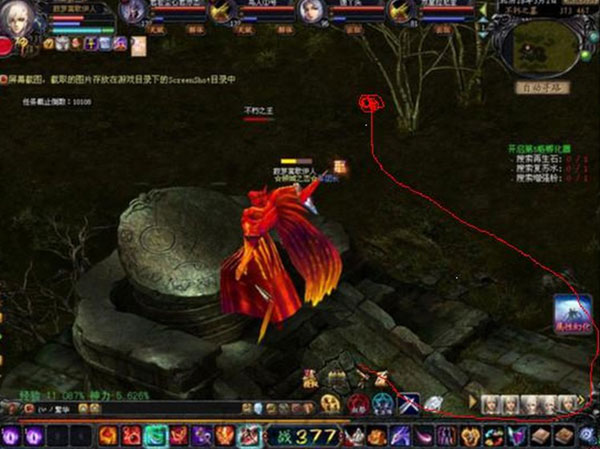 当你站在红线开始的地方,向下跑,跑到红圈处。注意屏幕右上角的坐标368,459这个点上,不朽之王不能传送你上去,技能也超出范围,十分安全。
