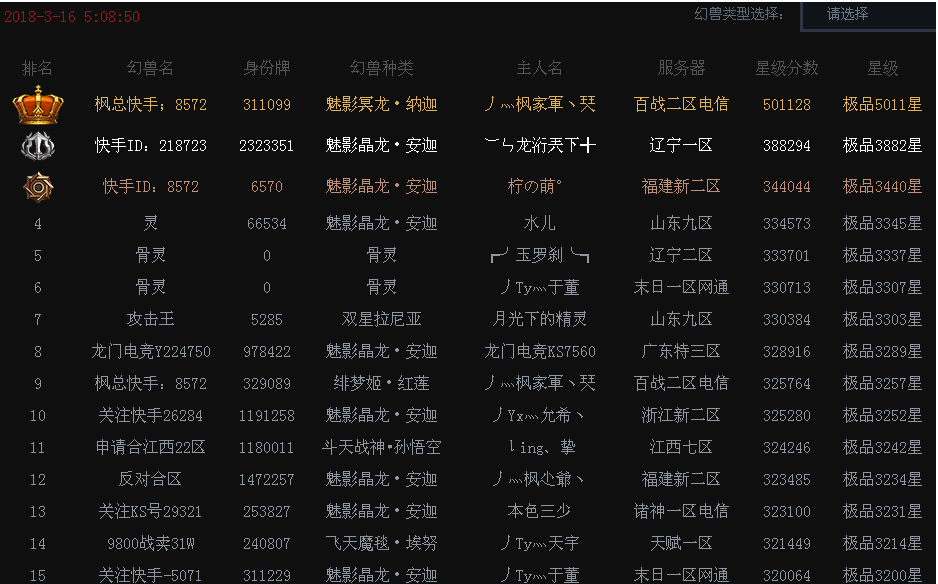 第一名毫无悬念(短时间内应该是无人可以超越了吧),而第十名的守门人则换成了一只来自江西七区的猴子,来自浙江新二区的魅影龙被挤到了十一名,下面就看看又经过一个月的努力,幻兽们都冲了多少星吧!