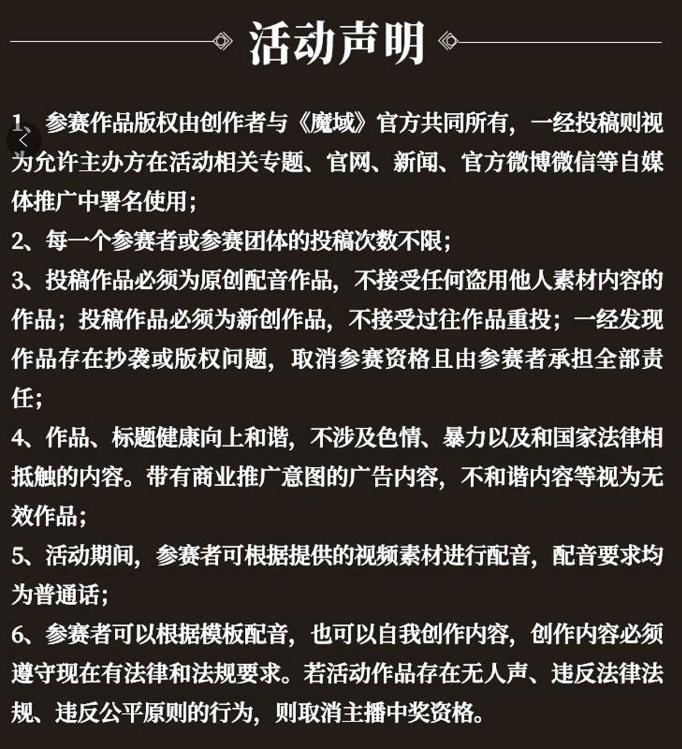 小记随便只点了其中一个视频,就发现已经有800多人在配音了哦,竞争很是激烈啊。当然,大家踊跃参加活动的时候,也要切记遵守官方的活动规则哦,如果因为违例而错失奖品,那就得不偿失了,小记这里也将官方的活动声明发给大家: