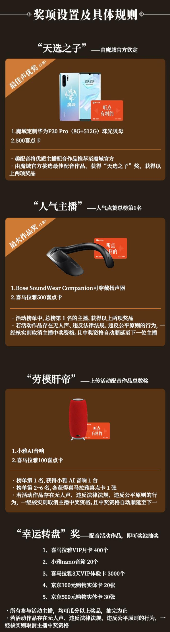 据说这次活动的奖品十分的丰厚哦,不仅有魔域定制华为P30 Pro手机,还有Bose SoundWear Companion可穿戴扬声器和小雅AI音响,除此之外,还有大量500元和100元的京东卡以及喜马拉雅VIP月卡等抽奖礼品,真的是太豪华了!
