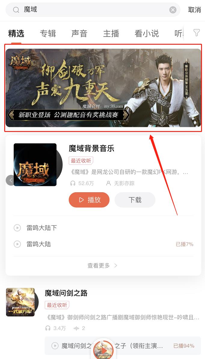 一、打开喜马拉雅APP(苹果和安卓各大应用商店均可下载),搜索“魔域”,在信息栏选择趣配音活动;