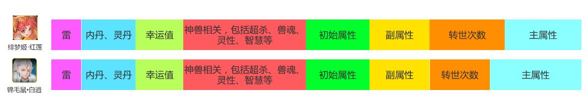 从图中可以看出,红鸡和锦毛鼠所有属性全部相同。这也就说明了,他们的最大副属性评分和最大初始评分是相同的,也就不存在溢出的情况。那么根据上面小记分析的官方规则,现在就只有转世次数有可能溢出了。我们都知道,幻兽是可以通过使用[转世水晶+1]、[转世水晶+2]和[转世水晶+3]来将幻兽最大转世次数提升250次的。这多出来的250次转世,能不能真的转化为主属性附加给锦毛鼠呢?