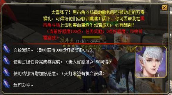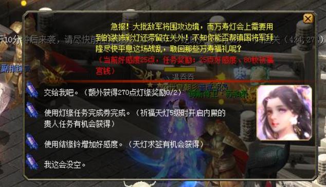 2、每天完成职业任务,300点灯缘(选择将军的找将军领,进去打一次怪搞定;选择侠客的找侠客领,挖一次宝搞定);