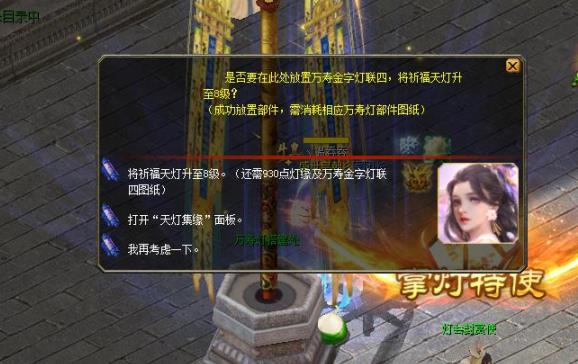 图纸也是在职业任务中产出(将军调兵遣将、侠客挖宝),如果一次职业任务搞不到图纸,请多做2次,真的是这里出……凑够足够数量灯缘和相应图纸就可以升级天灯。(这里想说,两个天灯进度是一样的,因为天灯都是一对一对的,这一对天灯的进度肯定是一样的,不要再问是升左边天灯先还是升右边天灯先了!)