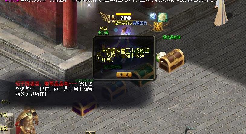 和王小虎对话会让你根据提示猜他说的是哪个箱子。一共四个箱子,分别是紫色、蓝色、绿色和褐色,提示分别是:(紫色)茄子圆溜溜,葡萄紫晶晶;(蓝色)抬头望望天,低头看看海;(褐色)腐烂的橙皮,古朴的树皮;(绿色)春草夏叶,翠湖嫩柳。选择了正确的箱子,王小虎就会让你自动寻路找到NPC,拿到彩灯继续自动寻路悬挂彩灯,再自动寻路回到接任务的NPC处就完成了。