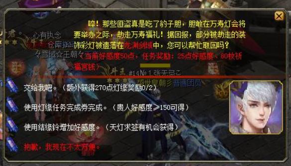 以上基本上就是我们在做灯缘任务时可能会遇到的任务和完成条件,有人要说了,如果当天接了不能完成的任务怎么办?如果接了不能完成的任务,5级以前,无解,因为你在卡任务,也无法转换职业,只有等12点任务重置接新的吧。5级之后,乾清宫内殿开放,通过和文贵妃、小皇子增进亲密度,可以获得灯缘任务完成券,直接完成灯缘任务。