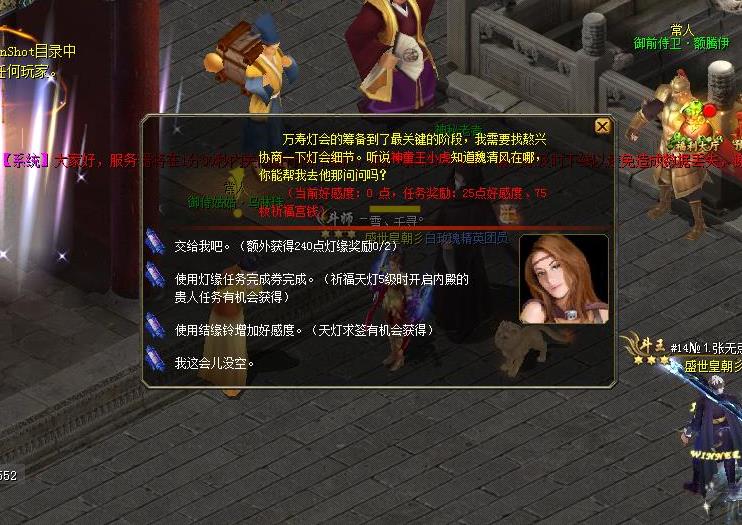 3、每天五个常人NPC(御前侍卫*2、御侍姑姑、乾清宫宫女、翰林院侍诏)会发布任务,每天至少有四个NPC发布的任务是有240、270或300的灯缘奖励,任务种类基本固定(小记后面会介绍)只是发布的NPC会有一定的变化。每天最多领2个NPC的灯缘任务,选择灯缘最多的NPC来接任务(5个NPC任务都可以接,第三个开始没有灯缘奖励,所以大家在接灯缘任务的时候优先选择灯缘值高、简单的任务来接),其中任务包含: