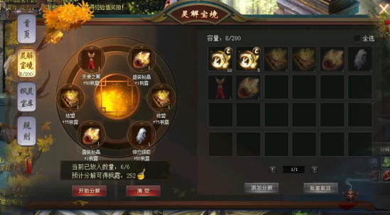 而这次觅宝最人性化的就是增加了一个灵解宝境,咱们把它理解为宝库就可以了,完美的解决了觅宝中背包不足的问题,让玩家有更好的觅宝体验。玩家在问卜中获得的奖品都将会直接进入宝境,玩家可以在宝境中对宝物进行分解、提取。分解的宝物可以获得相应的枫露值(但是需要凑齐6个宝物才可以分解哦!)