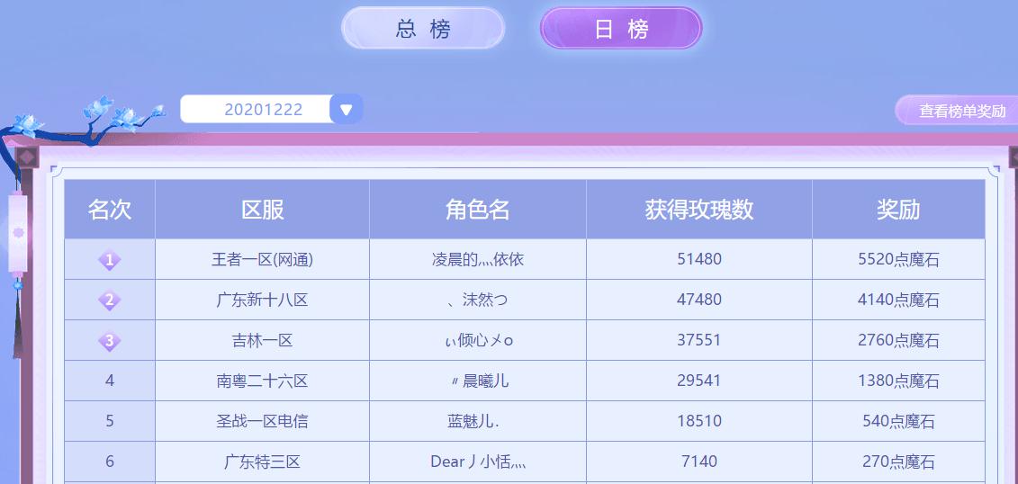 每天的日榜前六名的“花魁”都有魔石奖励哦!