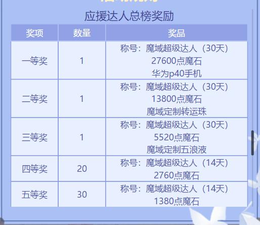 超级豪华的奖励,华为p40手机、魔域定制转运珠、魔域定制五粮液,以及海量魔石送不停,还有几十个鼓励奖,都有魔石拿!