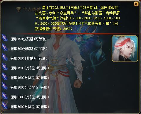 如果还没有领取牛气成长好礼的小伙伴记得要赶紧领取啦~不要等到25号后再来追悔莫及!要知道,牛气值达150、300、600、1600、2000时都有75级神火碎晶可以领取,牛气值达1200分时可以领取一份75级原初之火,牛气值达2400分时可以领取一份75级火灵·陨星,而牛气值达到最高3000分的时候,可以领取一份黯星之墓至宝匣[赠]!