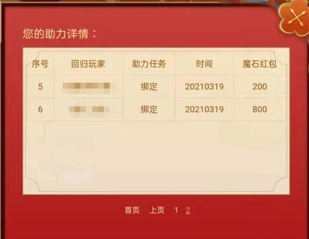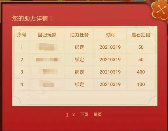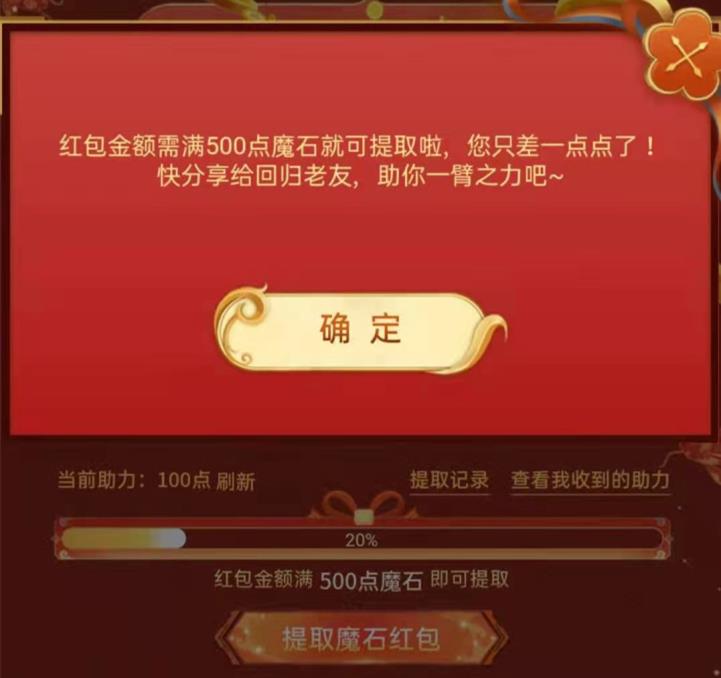 想要获得助力,增加自己红包的金额,就需要邀请回归玩家(2021年2月17日后未登录过游戏、等级≥130级、流失时战斗力>800战、成神且开三宠的回归玩家),回归玩家填写相应的邀请码,就可以为邀请玩家助力!刚好达标的号,召回后助力魔石只有50魔石!