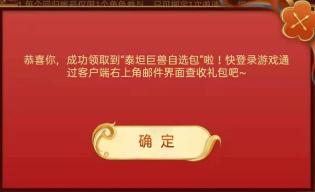 邀请的玩家有魔石奖励,被邀请的回归玩家也有奖励!回归玩家成功绑定邀请码后,即可免费领取1份泰坦巨兽自选包(成功领取后可登录游戏通过邮件界面查收礼包)!