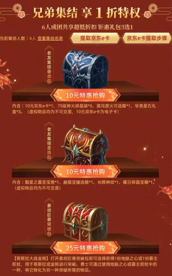 活动期间,玩家招募绑定回归好友,即视为组成团购队伍。当队伍中邀请者+回归玩家的人数达到6人,团购队伍全员都能以超低价格任意选购:老友集结奋战包(10元)/老友集结圣选包(10元)/泰坦巨兽突破包(25元)其中一款礼包,每个帐号限购1个。